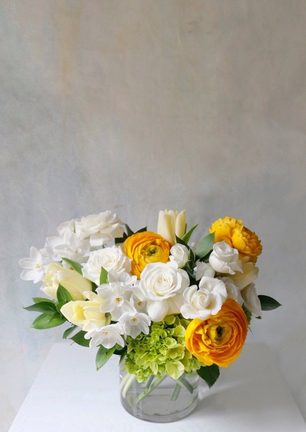 Brighten up your spring with Bee Mine, a vibrant floral arrangement featuring spring florals including Italian ranunculus, hydrangea, garden spray roses, locally grown narcissus, and Dutch tulips in shades of yellow, green, and white.
