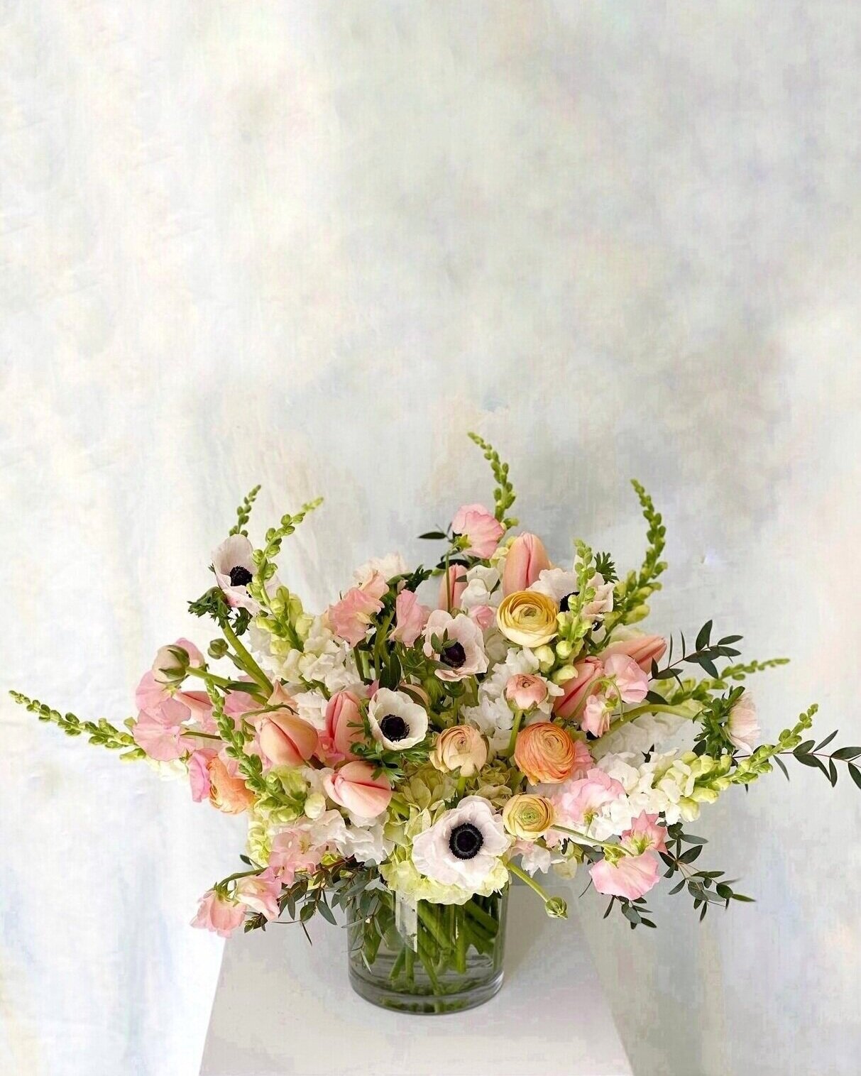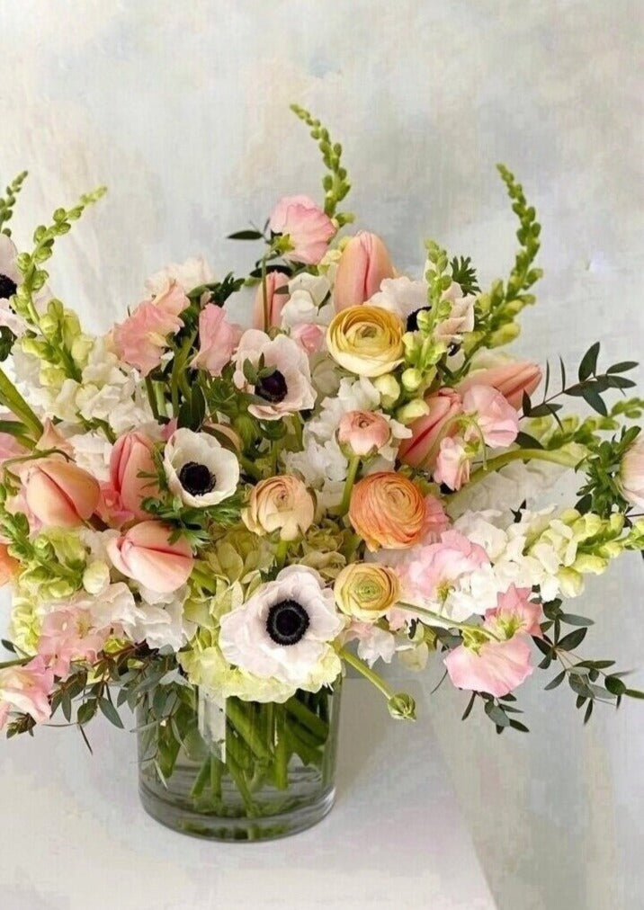 Taste the sweet life with our show stopping Peach Bellini arrangement. Textural locally grown Snapdragons, Anemones, Dutch Tulips, South American Ranunculus, and Japanese Sweet Pea dance with lush Hydrangea in this luxurious arrangement.