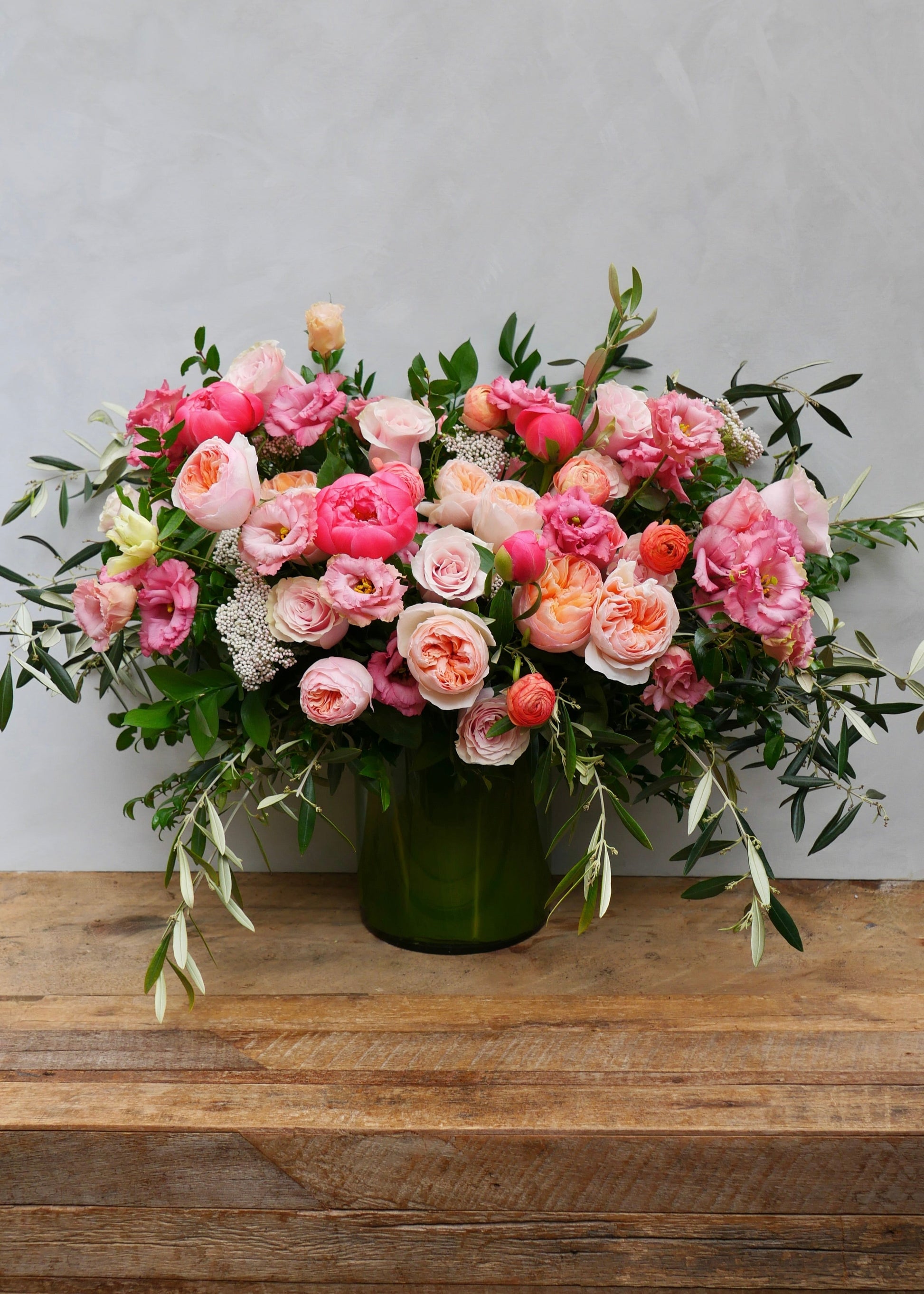 Feel like royalty with our lush 'Queen For A Day' arrangement. Packed with the designer's choice of the season's best blooms including roses, ranunculus, and peonies, this stunning bouquet also features accents of olive for a regal touch. Perfect for any queen (or king) in your life.
