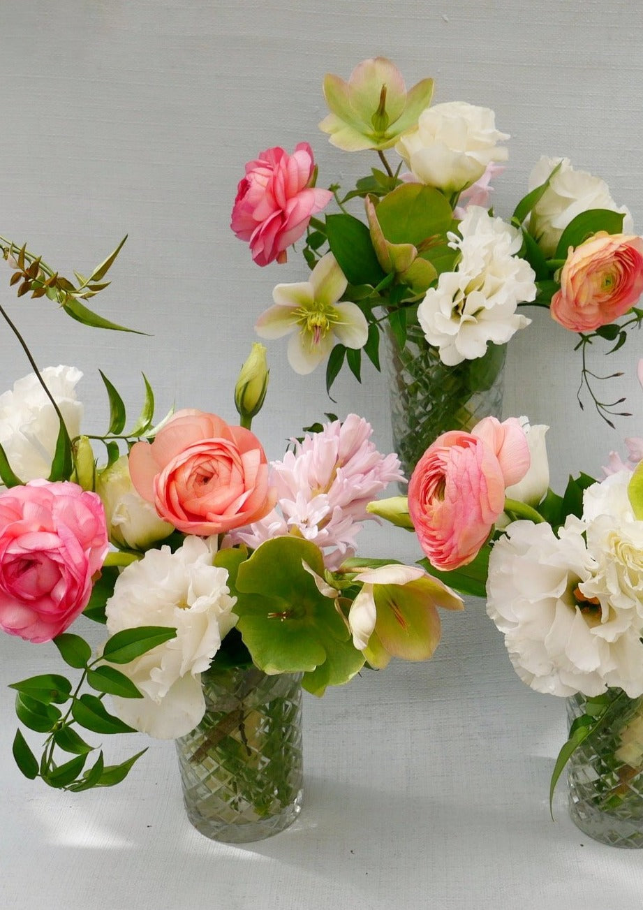 Elevate your tablescape with this Spring Trio bud vase set. Perfect for bringing the freshness of spring indoors, the trio features hellebore, ranunculus, lisianthus, and foliage in beautiful spring hues. Brighten up any room with this playful and quirky addition.