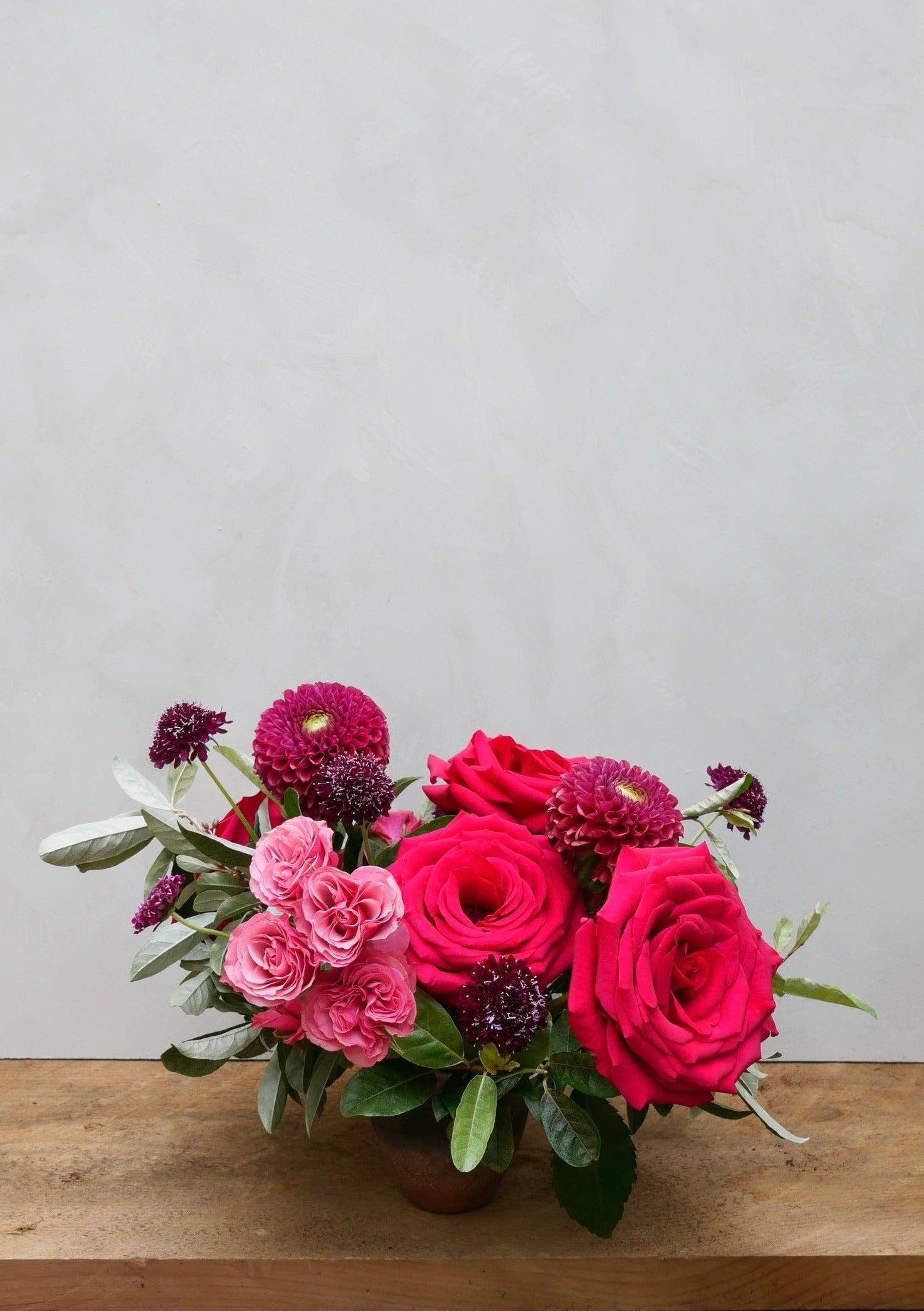 Elevate any space with our vibrant and lush Stones & Roses arrangement, featuring bright pink hues in roses, dahlias, and scabiosa with pops of orange ranunculus. Bring a touch of playfulness to your home with this stunning floral display.