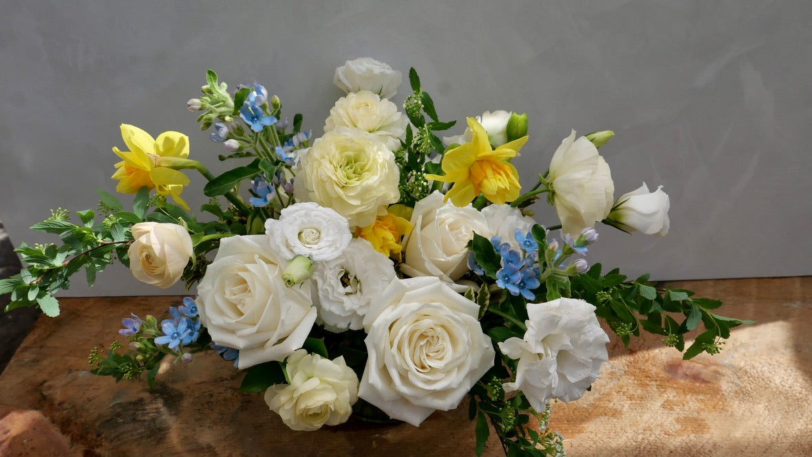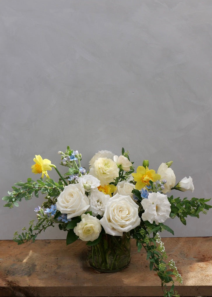 Introducing The Henry Collection: a whimsical and playful assortment of roses, tweedia, daffodils, and lisianthus in elegant white and yellow hues, with sweet pops of blue. Named after our founder's son, this collection encapsulates the magic and wonder of childhood.